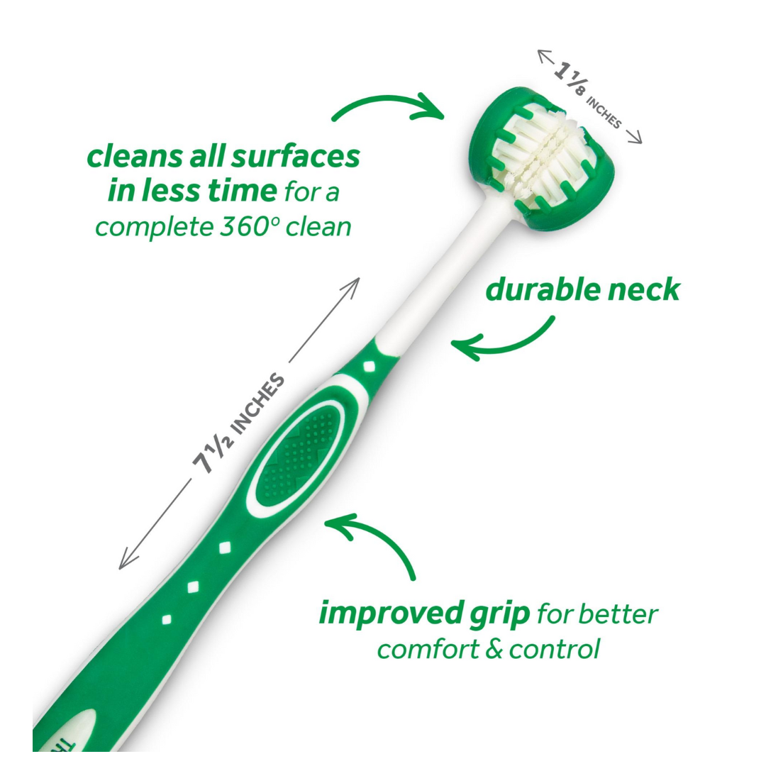 No todos los cepillos de dientes de perro son creados iguales. El cepillo de dientes TropiClean Fresh Breath Dog viene en dos opciones poderosas: nuestro cepillo de dientes TripleFlexTM con cerdas de triple cara para una limpieza de 360 °.